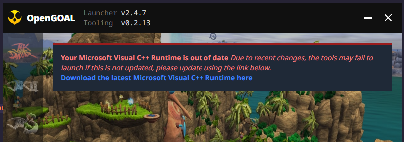 Due to recent changes surrounding how the OpenGOAL binaries are built, if you are on Windows, you are probably going to want to update to the latest version of the VCC Runtime or the games will no longer launch.
