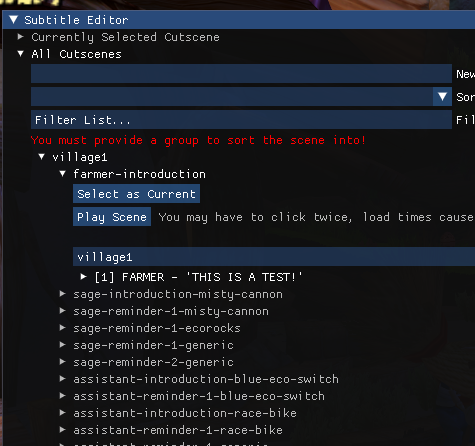 Under All Cutscenes you'll see we only have village1 as an option, and under that option, everything except farmer-introduction is greyed out.