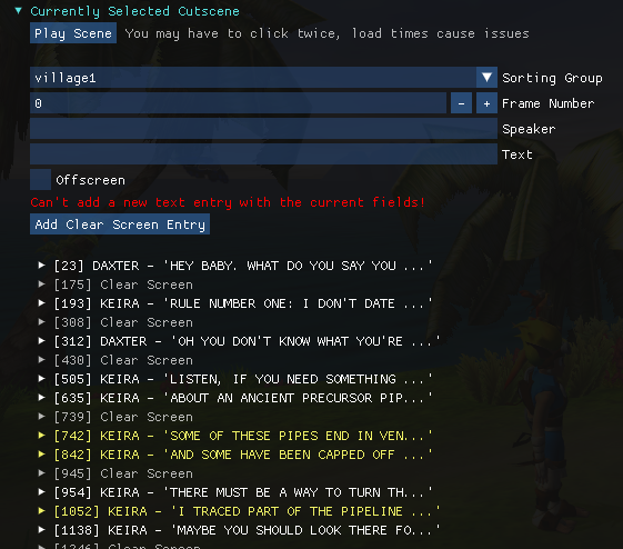 • The currently selected cutscene is rendered as cyan