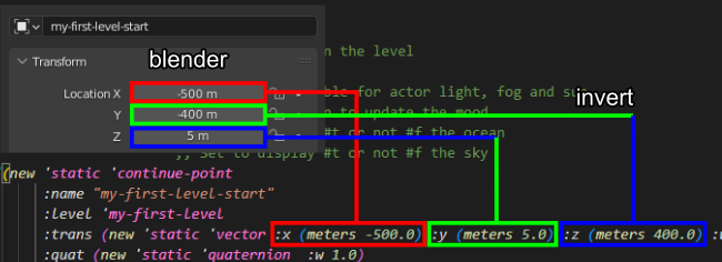 Now that you have an empty set for your continue-point, you can look at its position to copy it over to level-info.gc. Don't forget the axes conversion.