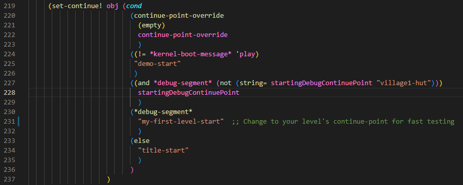 If you were to try to go in the game right now, you would still not be able to find your continue-point in the list. We first need to tell the compiler to add it. To do so, go to the bottom of the level-info.gc file.